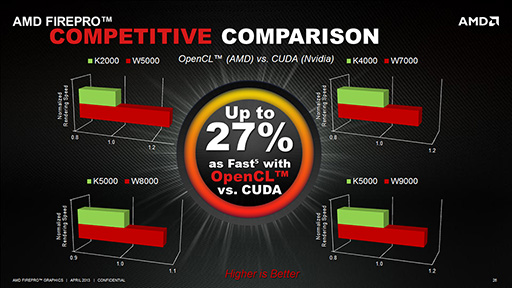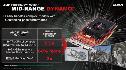 ただこの発言は,「マーケティング力ではたしかに負けているが,性能面では優位だ」という主張の裏返しでもある。たとえばエントリー市場向け製品であるFirePro W5000の場合,Keplerアーキテクチャを採用する競合製品「Quadro K2000」(関連記事)と比べて,「演算性能で2.5倍,メモリバス帯域幅にして1.6倍の性能を持っている」(Caracappa氏)という。