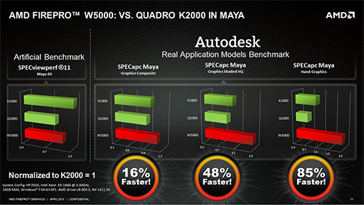 下に示したスライドは「SPECviewperf 11」と「SPECapcSM for Maya 2012」のテスト結果をまとめたもので,前者で競合製品よりスコアの低いFirePro W5000が,後者では圧倒するいうのが,AMDのメッセージである。