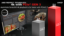 また機能面においては,NVIDIAのQuadroがまだ実現していないPCI Express Gen.3(以下,PCI Express 3.0)対応をとくにアピールしていた。Caracappa氏によれば,4K解像度の編集をサポートするAssimilateの映像処理ソフト「SCRATCH」の場合,PCI Express 2.0だと4K解像度の表示が満足に行えず,PCI Express 3.0が必要になるとのことだ。氏は,「PCI Express 3.0を始めとする新しい規格を競合よりも一足早くサポートしていくことを,AMDはとくに重視している」と語っていた。