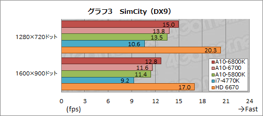 SimCityのスコアをまとめたグラフ3でも,全体的な傾向はBioShock Infiniteと変わらない。A10-6800KはA10-5800Kから11〜12%程度スコアを伸ばし,i7-4770Kに対しても38〜41%高いスコアを示すが,HD 6770を前にすると7割強というところに留まっている。