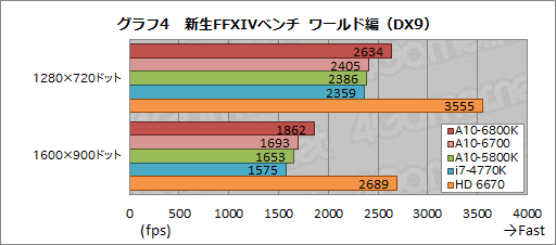 グラフ4は新生FFXIVベンチ ワールド編の結果となるが,1280×720ドットで「標準的な動作が見込める」とされる2000を超え,A10-5800Kに迫るスコアを示すi7-4770Kを,A10-6700はかわしている。A10-6800KはそんなA10-6700よりもさらに約1割高いスコアを示した。