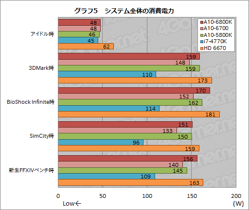 その結果がグラフ5となるが,A10-6800Kの消費電力値はA10-5800K比でプラス0〜12W。A10-6800KとA10-5800KのTDP(Thermal Design Power,熱設計消費電力)はいずれも100Wだが,GPUコアの動作クロックとメモリコントローラのスペック分,A10-6800Kのほうがわずかながら高めの値を出すということなのだろう。