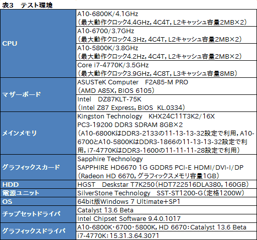 そのほかテスト環境は表3に示したとおり。A10-6800KとA10-6700,A10-5800K,HD 6670の検証にあたっては,テスト開始時点の公式最新β版グラフィックスドライバ「Catalyst 13.6 Beta」を用いる。i7-4770Kのテストに用いたのは,こちらもテスト時点の最新版となる「15.31.3.3071」だ。