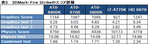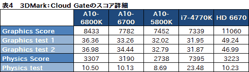 なぜこんなことが生じているのか。それは,両テストの詳細スコアを見てみると分かりやすい(表4,5)。Cloud GateもFire Strikeも,「Bullet Physics」ベースの物理シミュレーションをCPUで行う「Physics Test」のスコアで,i7-4770KがA10-6800K比で2倍以上のスコアを叩き出している。そして,より描画負荷の低いCloud Gateでは,Physics Scoreの占める割合が大きくなる。なので,CPU性能でRichlandやTrinityを圧倒するi7-4770Kのスコアが高くなるというわけだ。