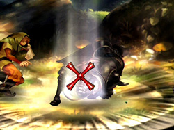 敵の攻撃を何度も受けたり【○ボタン】の「メガスマッシュ」を使ったりすると,剣が地面に突き刺さり一定時間使用不能状態となる。この場合,ファイターは再び剣を拾うまで素手状態となって攻撃力が低下するため,ダッシュ攻撃や空中タックルで敵を吹き飛ばしつつ,剣を拾う時間を稼ぐのが得策だ。