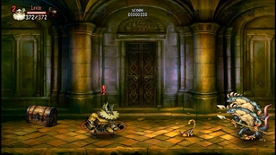 針の罠に気をつけつつ,出現する敵をすべて倒したら,隠し扉を破壊して奥にある宝箱を回収しに行こう。隠し扉の位置は,ステージ中央の扉から柱2つを越えた壁だ。ここには明かりがなく,暗い場所での戦いになる,松明を所持していない場合,無理に戦闘は行わず,宝箱だけ回収して部屋から出てしまおう。