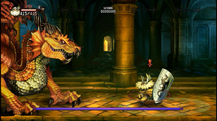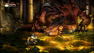 戦闘が始まったら,レッドドラゴンは横に広がる「ファイアブレス」や,ランダムに岩が降ってくる「落石」など,広範囲に広がる攻撃を仕掛けてくる。フロア自体も非常に狭いため,これらの攻撃をかいくぐって戦うのは困難だ。なので戦闘開始後は,右端のドアをすぐに開け,次のフロアに進んで戦いたいところ。ただし,ある程度は部屋に留まってダメージを与えておかないと,タイムオーバーになりやすいので,余力があるならば,踏ん張って戦うことも視野に入れたい。