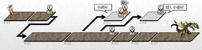 まずはレッドドラゴンが寝ている間にドアを開け,宝箱を回収する。運が悪いと宝箱のトラップが発動し,レッドドラゴンを起こしてしまう。その場合は,すぐにPOINT Eへ向かおう |