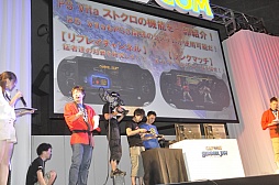 ここで,PS Vita版ストクロを使ったウメハラ氏とときど氏によるエキシビションマッチが行われることに。使用キャラクターはウメハラ氏がガイ&ブランカ,ときど氏がブライアン&ジャックXだ。試合は,PS Vitaの操作になかなか馴染めない様子のウメハラ氏を終始圧倒したときど氏が勝利を収めた。