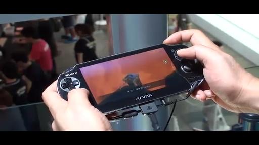 また,撮影環境の問題で映り込みがあるとはいえ,PS Vitaの有機EL画面の視野角の広さにも注目してほしい。本体を上下左右にと動かしまくっても,ほぼ同じように見えている。掲載したプレイレポートでお伝えしたように,SCEブースに本作の試遊台が四つある。ゲーム開始から最初のボスらしき敵を倒すところまでプレイできるので,独特の浮遊感などを味わってほしい。