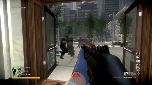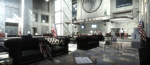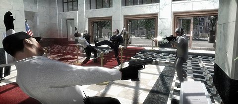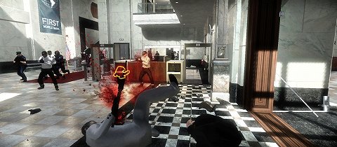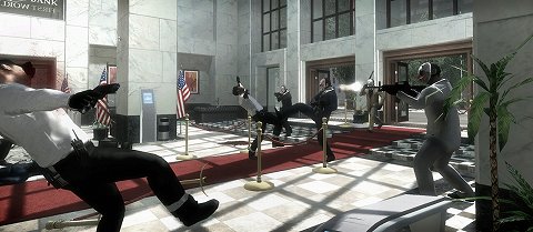 突入後しばらくすると当然,警察官やFBIエージェント,SWATチームが銀行に到着し,プレイヤーに襲い掛かってくるので,仲間と協力して敵を排除しながら奥を目指していく。窓の外からはスナイパーが狙っていたりするので,警察官などの姿が見えない場所でも油断はできない。