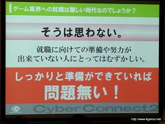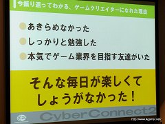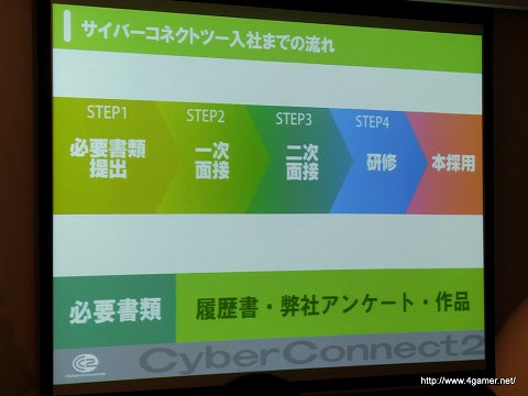 以前4Gamerでもそのレポート記事をお伝えしたことがあるが,その内容は,「どうすればサイバーコネクトツー(もしくはゲーム会社)に入れるのか」「どうしたらゲームクリエイターになれるか」という疑問に対する“解答”を“実例”とともに披露するという,普通の会社説明会とはひと味も二味も違うものであった。同社の公式サイトでは,2010年9月に東京で行われた会社説明会のUstream放送アーカイブを視聴できるので,興味のある人は,以下URLにアクセスし,視聴してみてほしい。