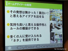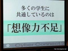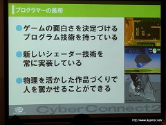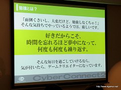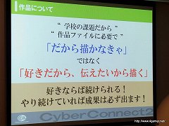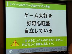 なお渡辺氏は,会社説明会のUstream放送アーカイブでは,アーティスト/プログラマー/ゲームデザイナーの3職種に関して,サイバーコネクトツーが求めているスキルや人物像などが,実際に入社試験で合格/不合格となる例とともに紹介されているので,参考にしてほしいと述べていた。
