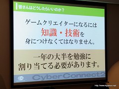 サイバーコネクトツーが定期的に実施している会社説明会同様,厳しい“現実”を提示しつつも,どうしたらゲームクリエイターになれるのかという“答え”を示してくれるという,非常に稀有な体験が得られた場となったので,ゲームクリエイター志望の人は,ぜひ最後まで読み進めてほしい。