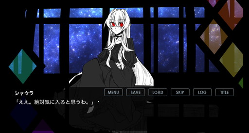 本作はマルチエンドのビジュアルノベルで,シンプルな作りながらグラフィックスやサウンドに独特の味があり,自然と引き込まれてしまう。悪役令嬢シャウラとの会話が星空の見える夜の監獄の鉄格子越しに行われるのも,幻想的な雰囲気を生み出している(図15,彼女の話の内容も星座や神話にもとづくものが多い)。監獄の中で処刑を待つ彼女のどこか諦観したような態度は,トゥルーエンドに到達した時にその意味が明かされる。