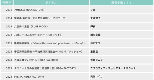 こうした制約のなかでも敵やライバルとして女性キャラが登場する作品は少なくとも30本程度あり,いわゆる悪役令嬢とみなせそうなのはその半分強だった。ただしこのなかに移植作品や,(別のキャラが該当するのでないかぎり)シリーズものの続編は含まれていない。
