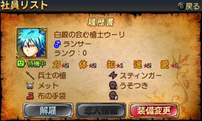 抜群のリーチを誇るランスを扱う近接職。そのリーチを活かし、前衛職を盾として中衛からモンスターを攻撃するという基本戦術以外にも、前衛に配置してアタッカーとして運用することも出来る。スキルに関しては一撃必殺や乱れ突きなど、同じランサーでも性格によって違いが出るようだ。