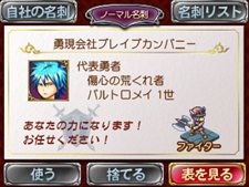 まずは、ニンテンドー3DSのカメラで、家族や友人の顔を撮影!すると、撮影した顔写真から認識機能を使って、算出された各種情報から勇者の顔や能力が自動で生成される!!生成された勇者が気に入ったら、好きな名前を自由に入力して「名刺」をゲットしよう!