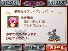 「名刺」には、そのユーザーの会社情報(表/写真左)と「代表勇者」(裏/写真右)が記載されている
