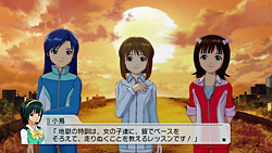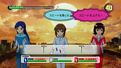 この三つ以外にもう一つ,「地獄の特訓」が用意されているが,これは特殊なレッスンで,ユニットが前にも後ろにも進めなくなったとき,スケジュールに現れるというもの。具体的には,ユニットのメンバーのスピードを調整し,ペースを揃えて3人を仲良く走らせるという内容で,タイトルから「神社の100段の階段を,ウサギ跳びで50セット」とかを想像した人は残念賞。中身はそれほど地獄っぽくはないが,初プレイのときには,いろんな理由できっとお世話になるはずのレッスンだ。私はなった……たびたびなった。