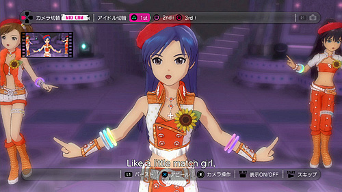 もっとも,ステージシーンを撮影することも可能で,このあたりがPlayStation 3版では強化されている。スクリーンショットを見ればお分かりのように,画面のセンターに置きたいアイドルをワンボタンで選択できるようになったほか,歌詞の表示/非表示も選べる。さらに,カメラがアイドルに追従する/しないといったことも選択可能で,撮影の楽しみが広がった雰囲気だ。