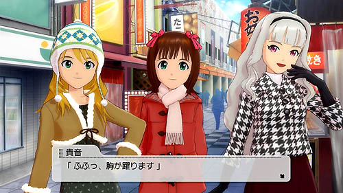 というわけで,一つめは,アイドルの一人である高槻やよいと,竜宮小町のリーダー水瀬伊織のツーショット。6人兄弟の長女で,両親を手伝ってがんばるやよいと,冗談みたいな大金持ちのお嬢様である伊織。仕事のうえではライバルであり,暮らしも価値観もまったく違うはずなのに,プライベートでは仲がいいのだ。画像で見られる,二人の冬服にも注目してほしいかなーって。