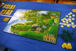 本イベントの主催者でもある大手メーカー,アークライトのブースでは,クトゥルフ神話をテーマにした「エルダーサイン 完全日本語版」や,ドイツ出身の有名ゲームデザイナー,Reiner Knizia(以下,ライナー・クニツィア)氏のデザインによるボードゲーム「キングダム」,ドラフト型の双六ゲーム「ロスト・テンプル」などの新製品が販売されていた。