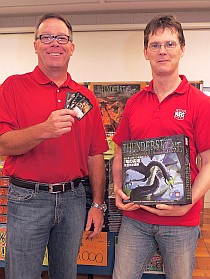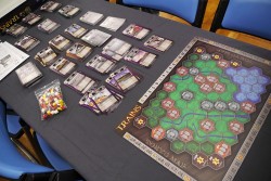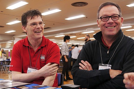 さらに人気のデッキ構築型カードゲーム「サンダーストーン」では,最新拡張セットである「竜の尖塔」のデモ展示が行われ,ファン達の注目を集めていた。その場にいた,同作のデベロッパ,AEGのCEO,John Zinser(ジョン・ジンサー)氏と,リードデベロッパーのMark Wootton(マーク・ウットン)氏にお話しをうかがえたので,以下に掲載しよう。