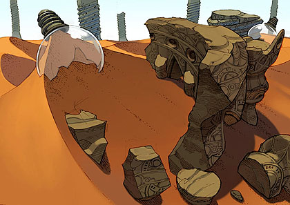 古代遺跡と巨大な電球が点在する不思議な砂漠。強烈な日差しが主人公たちを容赦なく照らす。