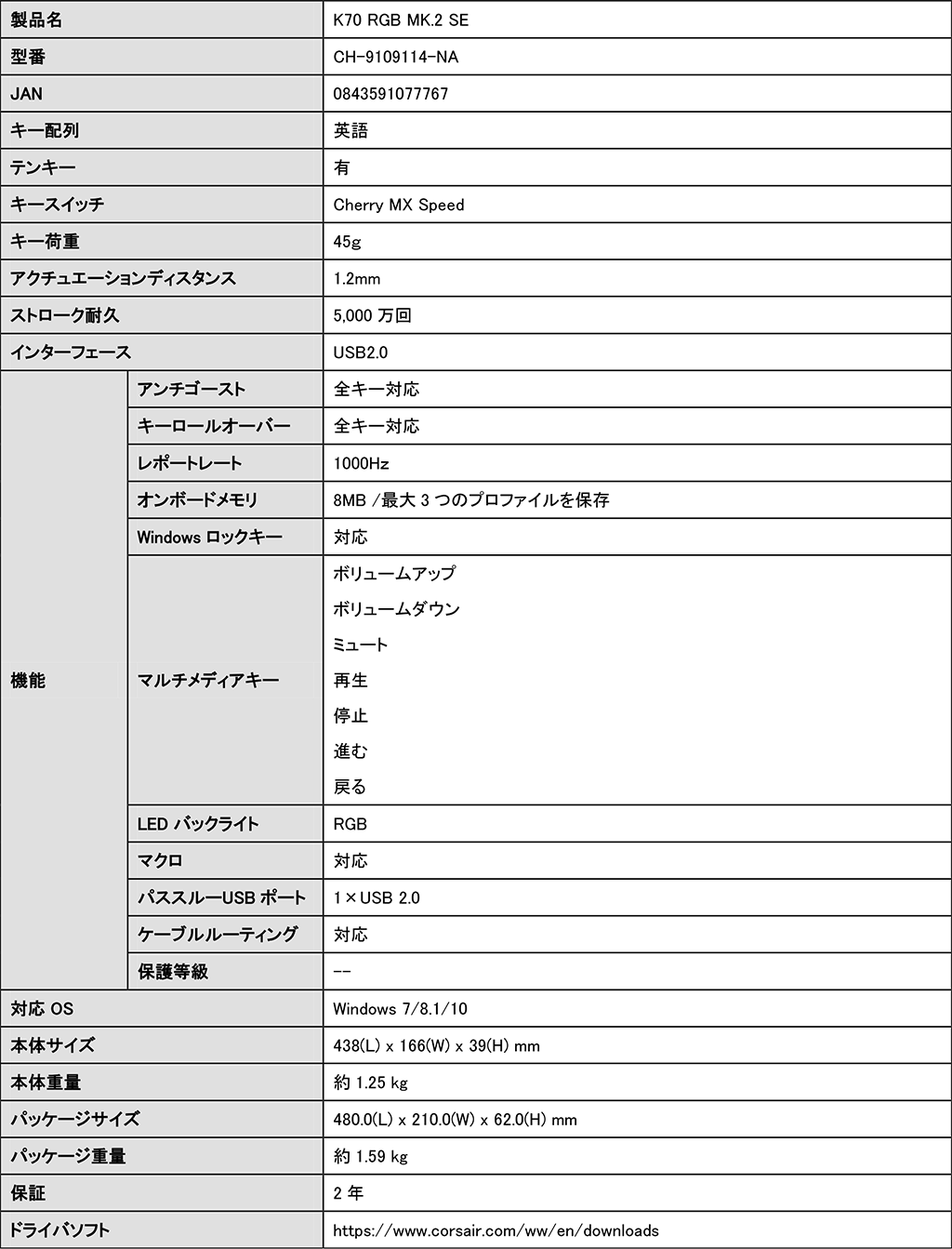 銀と白のカラーが目を惹くCorsair製キーボード「K70 RGB MK.2 SE」が国内発売