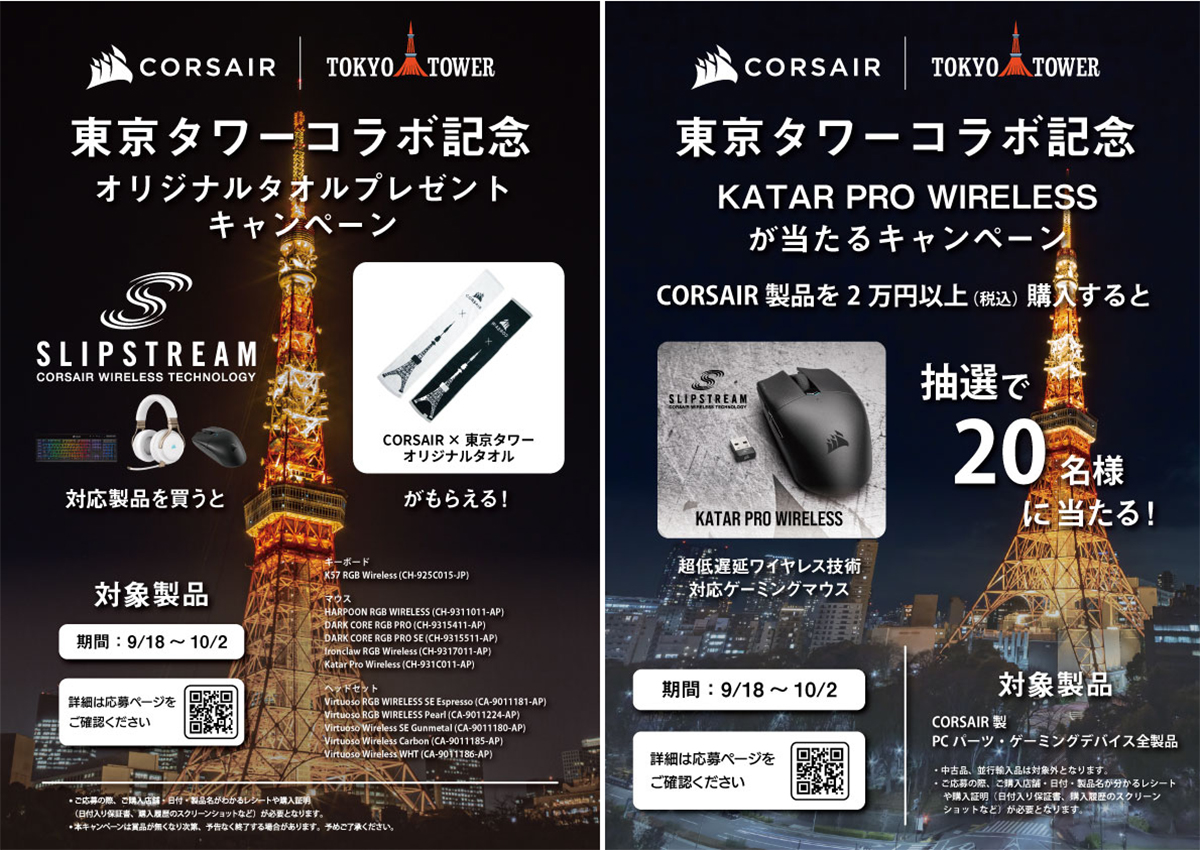東京タワーがCorsairカラーに染まるコラボイベントを実施。マウスやオリジナルグッズが当たるキャンペーンも