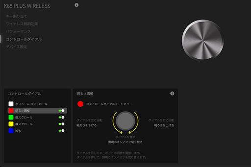 K65 PLUS WIRELESSの前面でもうひとつ特徴的なのが,右奥に設けられている多機能ダイヤルだ。音量調節に使うのが一般的だが,そのほかにもLEDイルミネーションの輝度調節,アプリ画面のスクロール,拡大/縮小という合計4つの機能が割り当てられる。ダイヤルの機能は,[Fn]キー+矢印キーの同時押しで4つの機能を切り替えられる仕組みだ。
