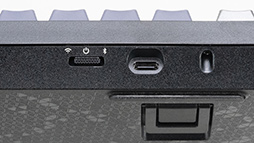 一方,左背面のスイッチをBluetoothマーク側にセットするとBluetooth接続モードに切り替わる。Bluetoothの接続先は,最大3台まで本体内に記憶可能で,[Fn]キーと[Hone/PgUp/PgDn]キーの同時押しで切り替え,同時長押しでペアリングできる仕組みだ。たとえば,ノートPCとタブレットでK65 PLUS WIRELESSを共用する,といったことが簡単にできるわけである。