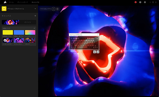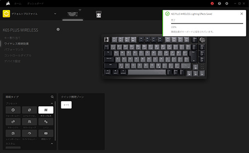 一方,ワイヤレス接続時には「ワイヤレス照明効果」の設定に切り替わる。ワイヤレス照明効果ではレイヤーが使えず,9種類のプリセット済み効果と「スタティックカラー」の合計10種類から,発光パターンを選択するだけだ。ワイヤレス照明効果の設定を変更すると,自動でK65 PLUS WIRELESSの本体フラッシュメモリに設定が転送され,LEDイルミネーションが切り替わる仕組みだった。