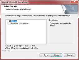 3DMarkは英語版のソフトウェアで,当然のことながらインストーラも英語だが,特段難しいことはないだろう。64bit版と32bit版のバイナリが用意され,64bit環境では64bit版が,32bit環境では32bit版が自動的に用意される仕様となっており,64bit環境に限り,インストール時にカスタムセットアップを選んでおけば,32bit版バイナリもインストールできるというのも,3DMark 11から変わっていない。
