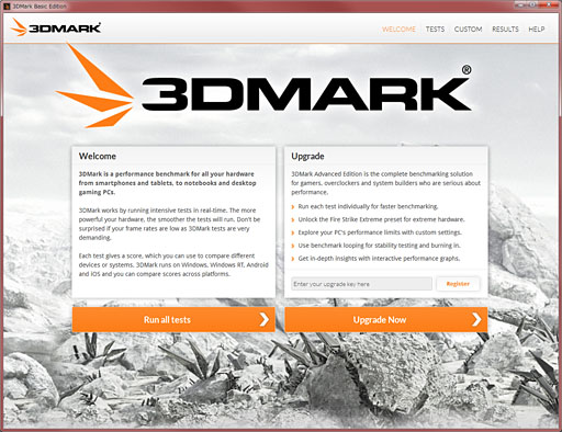 というわけで,下に示したのがセットアップ直後,初回起動時のメインメニューだ。3DMarkはひとまずBasic Editionとして立ち上がってくるので,Advanced EditionやProfessional Editionのアップグレードキーを購入済みなら,「Enter your upgrade key here」の枠に入力して[Register]ボタンを押そう。購入したい場合は[Upgrade]ボタンを押せば,販売サイトへのリンクがWebブラウザで立ち上がる。