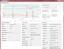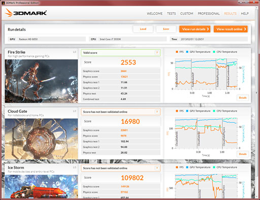 というわけで,テストスイートを実行し,すべてが終わると,計測後,スコアが「RESULTS」タブに表示される。スコアといっしょに,フレームレートとGPU温度,CPU温度の推移も参考としてグラフで示されるのが,新世代3DMarkの特徴といえそうだ。また,タブのすぐ下に用意された[View run details]ボタンをクリックすると,別ウインドウでシステム情報なども確認できる。