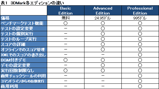エディションによる違いは表1のとおりで,どのエディションでもベンチマークテストおよびデモの実行は可能だが,無償版となるBasic Editionでは,デモとテストの実行順やテスト内容の細かなカスタマイズが一切行えず,テスト結果は,常にFuturemarkのオンラインスコアサイトへ送信され,さらに詳細表示を行えないという制限がある。
