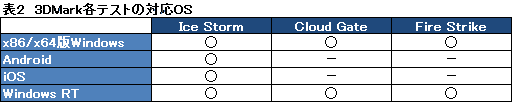 このうち,PCとモバイルデバイスを横断的にテストするのに使えるのはIce Stormのみ。一方,Cloud GateとFire Strikeはx86/x64版WindowsとWindows RTシステムで実行可能とされている(表2)。