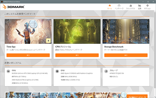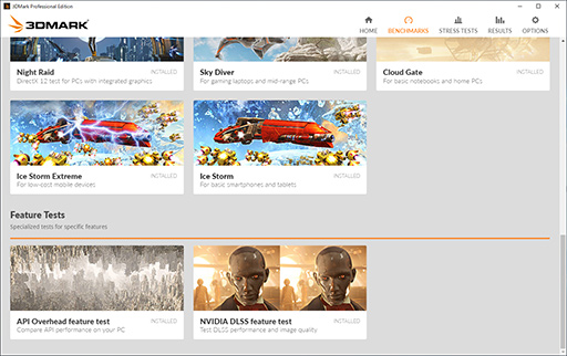 そのほか3DMarkには,製品のバージョン情報を確認したり,基本設定を変更したりできる「HELP」タブ,そして,Professional Editionには,同エディション専用の設定項目である「PROFESSIONAL」タブが用意されている。このあたりは基本的に,3DMark 11から変わっていない印象だ。