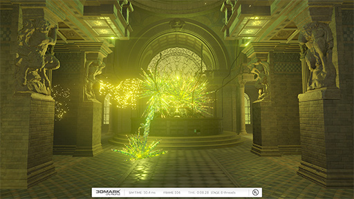 テストは先の2つと異なり4パート。「Graphics test 1」ではジオメトリ処理と光源処理に重点が置かれ,「Graphics test 2」ではGPUベースのパーティクルおよびパーティクル光源に重点が置かれている。