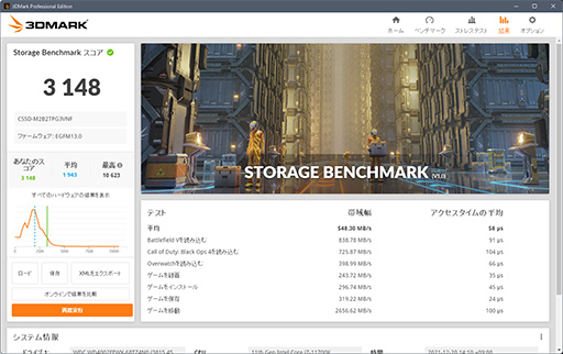 本バージョンは,バージョン 2.21.7312で導入となった3DMark Storage Benchmarkの結果表示画面に,いくつかの新要素を追加したのがポイントである。