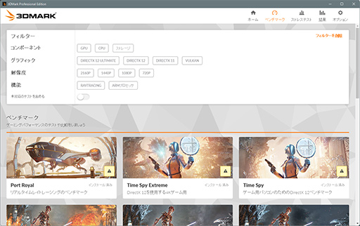 もう1つの新要素は,「フィルターパネル」という機能だ。「ベンチマーク」タブにテストをしたい項目を選択するフィルターボタンが表示されるようになり,任意のボタンを押すと,そのボタンに対応するテストをフィルターパネルの下に表示してくれる。たとえば,[1440p]ボタンを押すと,解像度2560×1440ドット以上の条件を想定したテストが列挙される仕組みだ。