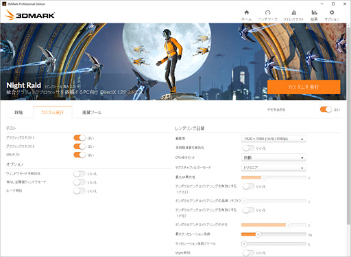 以上がNight Raidの概要だ。冒頭で述べたとおり,現在は統合型GPUのDirectX 12対応が進んでいるが,Time Spyではスコアを取りにくいことがあったので,Night Raidがそれに代わる指標として使えるようになるとすれば大いに歓迎したいところだ。また,エントリークラスの単体GPUが持つ3D性能の検証にもおそらく使えるだろう。