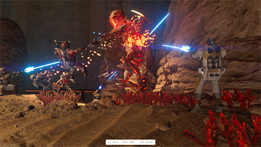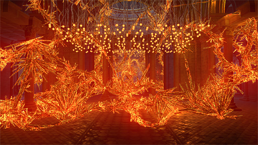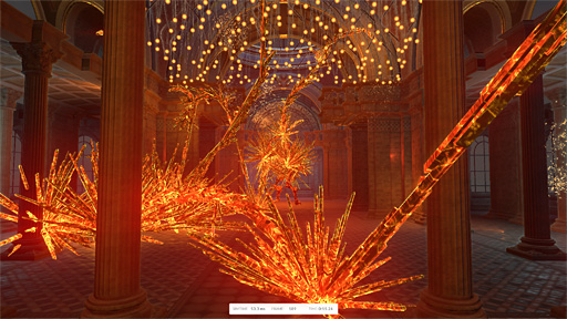 固定光源と動的光源の両方に対し,スクリーンスペースリフレクション(Screen Space Reflection)やアンビエントオクルージョン(Ambient Occlusion)を適用することで光の表現を行い,それによって負荷を与えている。同時にパーティクルシステムを用いた描写を加え,さらにポストプロセスとしてレンズ効果やブルームも適用するといったものである。