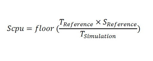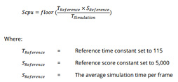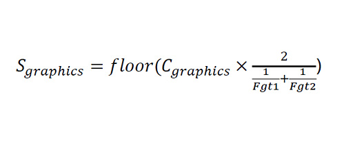 Graphics scoreの計算式は下に示したとおりで,「Graphics test 1とGraphics test 2それぞれにおける平均フレームレートの逆数を分母として足した結果分の2」に定数208.33を掛け小数点を切り捨て(floor)たものとなる。