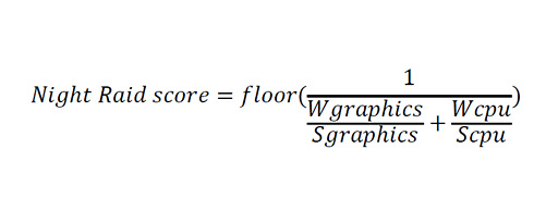 Night Raidでは,以上の3つのテストでそれぞれ平均フレームレートを計測し,そこから「Graphics score」および「CPU score」を算出し,両方の値から総合スコアを求めることになる。スコアの算出方法は基本的にTime Spyと変わっていない。