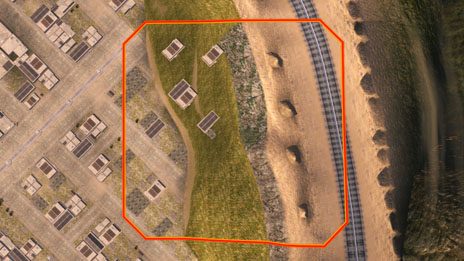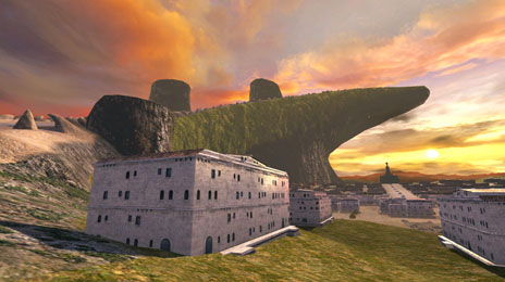天への階段が遺跡として眠っていた古代から続く都市。今にも発進しそうなウィルゲムが控え、岩や建物の障害物があり高台と低地が斜面で繋がっている場所が戦いの舞台となる。