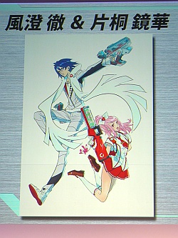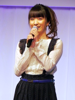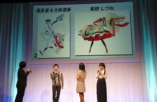 イラストのお披露目に続いて壇上に登場したのは,たった今紹介されたキャラクター達の声を演じる声優さん達。風澄 徹役の阿部 敦さん,片桐鏡華役の金元寿子さん,竜胆しづね役の植田佳奈さんのお三方だ。