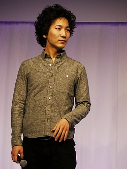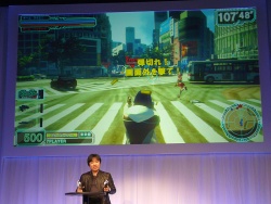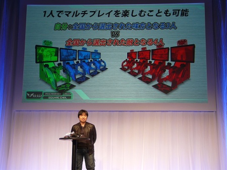 ![]() スクウェア・エニックスプロデューサー門井信樹氏。本作を「アーケード対戦ゲームの歴史を変えるゲーム」と紹介 |